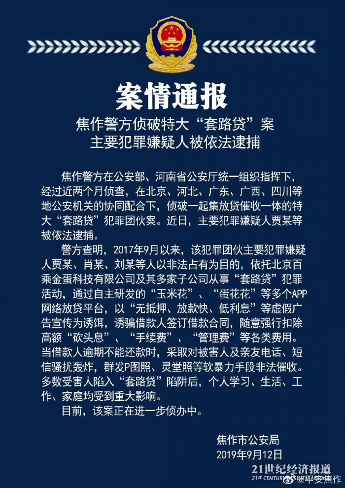 9月12日,河南焦作警方公安发布公告。公告指出,2017年9月以来,贾某、肖某、刘某等人以非法占有为目的,依托北京百承金蛋科技有限公司及其多家子公司从事“套路贷”犯罪活动,通过自主研发的“玉米花”“蛋花花”等多个APP网络放贷平台,以“无抵押、放款快、低利息”等虚假广告宣传为诱饵,随意强行扣除高额“砍头息”“手续费”“管理费”等各类费用,且采用非法催收手段。