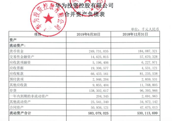 从合并资产负债表看,截至2019年6月30日,华为的货币资金为2497.31亿元,流动资产为5830.79亿元,现金和资产都家底丰厚。