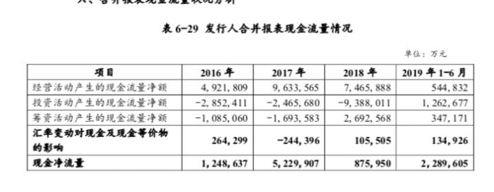 华为也指出,2018 年经营活动现金净流量较 2017 年 减少 216.77 亿元,降幅为 22.50%,主要因为 2018 年加大了研发投入,并且 适当增加库存;2019 年上半年经营活动现金净流量较 2018 年上半年增加 160.00亿元,增幅为 151.63%,主要因公司规模增长,回款增加。