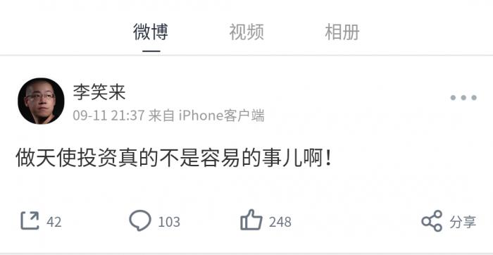 9月11日晚上九点半,李笑来发布微博称“做天使投资真的不是容易的事儿啊!”,疑似回应公信宝事件。
