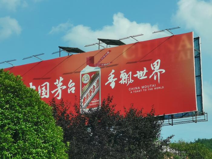 7月16日,21世纪经济报道记者从茅台镇返程至遵义市的高速路上,“中国茅台”的新企业形象广告牌迎面扑来。