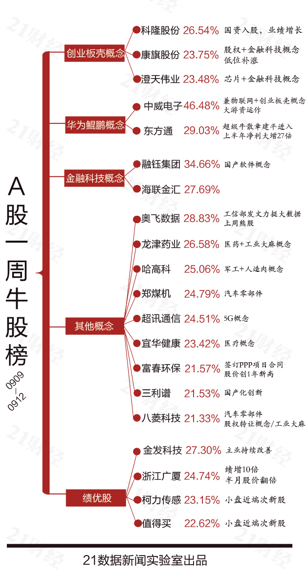 作为最强牛股,中威电子周涨幅达46.48%,该股兼有华为鲲鹏、物联网、创业板壳等热门概念,且有大游资在运作。