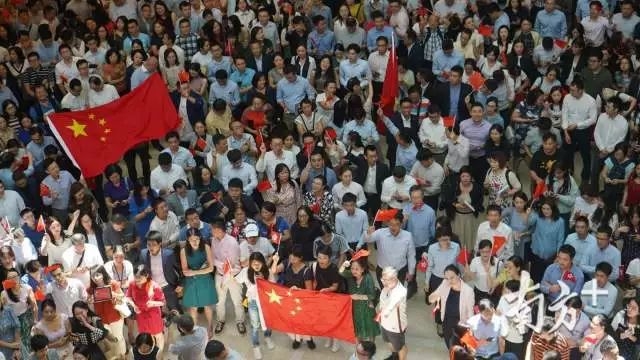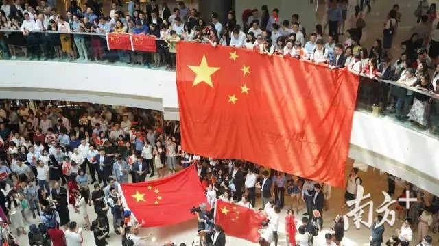 在活动现场,上千名市民聚集在一起,挥舞手中的国旗,面向悬挂的国旗,大声合唱国歌。在歌曲间隙,现场市民交替用普通话和粤语高喊“中国香港加油”“中国加油”。