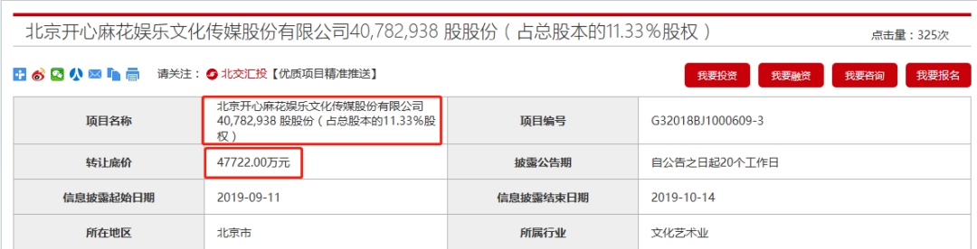这也是中文投第三次公开挂牌转让此部分股权,挂牌价从第一次挂牌时的6.12亿元降至4.77亿元,降幅约22%,这意味着开心麻花的保底估值也降至42亿元左右。