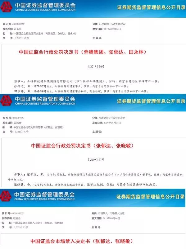 9月4日,证监会对奔腾集团及其董事长、董秘等高管连发三张罚单。奔腾集团因未按规定履行信披义务、信披中存虚假记载等违规事实被罚60万元;奔腾集团董事长张郁达及副董事长张晓敏夫妻二人共同被罚没422.22万元,并被终身禁入证券市场。