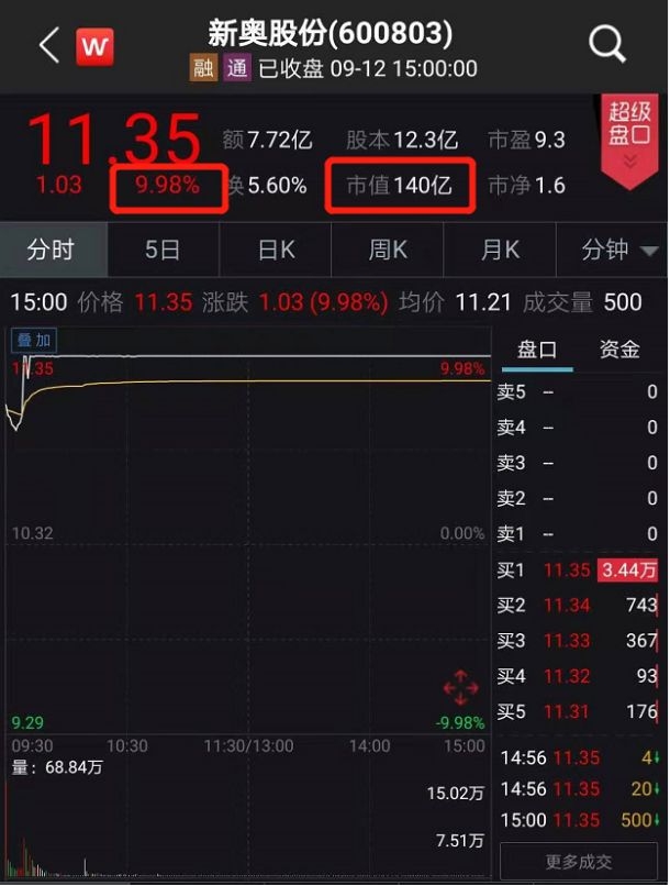 而这也是新奥股份复牌连续两日出现涨停。截至9月12日收盘,新奥股份报收11.35元,市值为140亿元,超3万手买单封上涨停板。