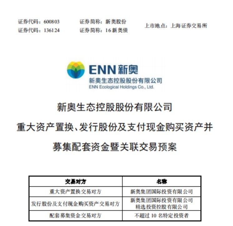 日前,新奥股份正式公布关联交易预案,上市公司拟通过资产置换、发行股份及支付现金的方式向新奥国际及精选投资购买其持有的新奥能源合计3.69亿股股份,占截至预案签署之日发行流通股总数的32.81%。