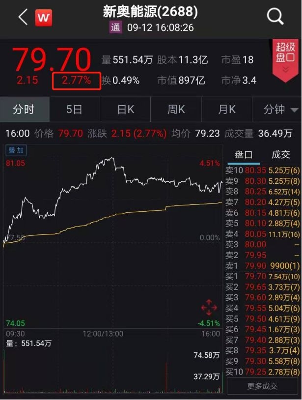 同样,9月12日新奥能源早盘开盘也出现明显的异动,股价短时冲上高位。截至当天收盘,新奥能源股价报79.70港元,涨幅2.77%。