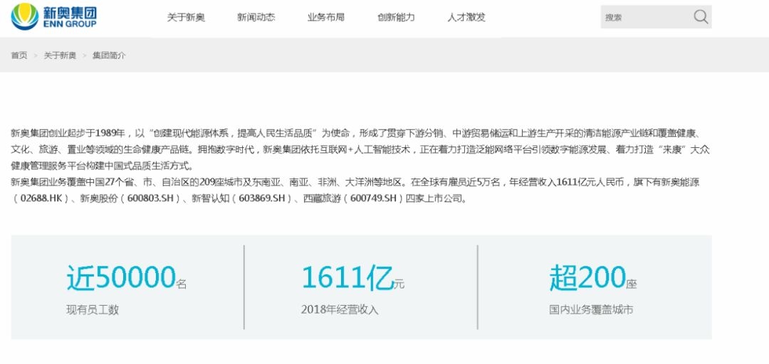 据新奥集团官网介绍,新奥集团创业起步于1989年,现已形成贯穿下游分销、中游贸易储运和上游生产开采的清洁能源产业链和覆盖健康、文化、旅游、置业等领域的生命健康产品链。新奥集团年经营收入1611亿元,旗下有新奥能源、新奥股份、新智认知、西藏旅游四家上市公司。