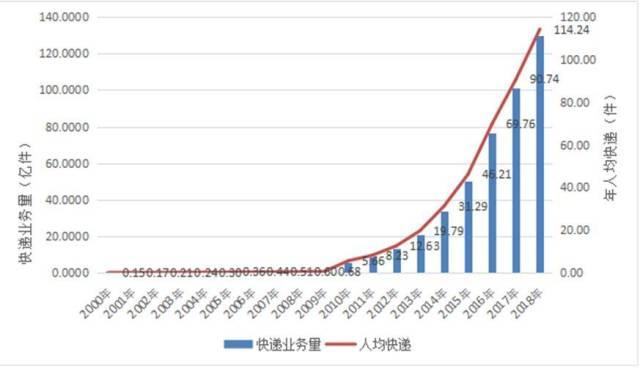 从快递看,广东快递业务量和业务收入多年来稳居全国首位。2000-2018年快递业务量年均增长46.6%,年人均快递量由2000年的0.15件/人发展到114.24件/人。2018年,广东快递业务量达129.62亿件,快递业务收入为1411.73亿元,快递业务收入占邮政业务收入的88.6%。