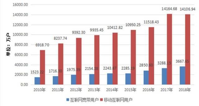 从互联网和数据通信看,2018年底,广东固定互联网宽带用户达3667.65万户,2001年以来年均增长13.2%;移动互联网用户达1.41亿户,2010年以来年均增长9.3%,普及率达124.3户/百人;移动互联网接入流量2016年以来连续三年超倍数增长,2018年人均使用流量达74.55GB/人。