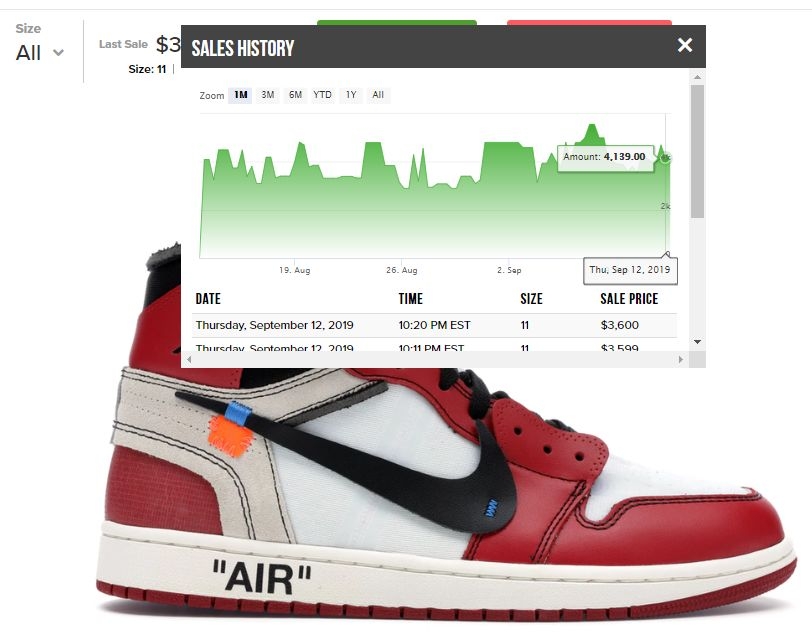 潮鞋Air Jordan 1 Off-White Chicago 一月价格走势。图片来源:stockx网页截图
