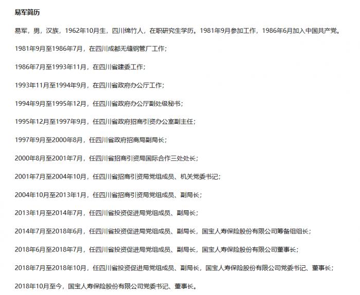 公开资料显示,易军1962 年 10 月生,四川绵竹人。2018 年 5 月起担任国宝人寿董事长,同年7月起兼任该公司党委书记。