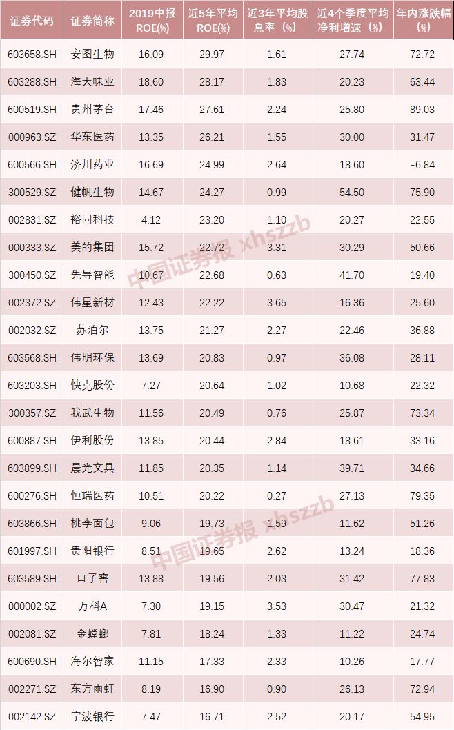 结果显示,仅25只个股符合上述标准。这25只个股,近5年平均ROE(扣非/摊薄)的平均值为21.74%;近3年平均股息率的平均值为1.83%;近4个季度平均净利增长率的平均值为24.82%,年内股价涨幅平均值为43.64%。