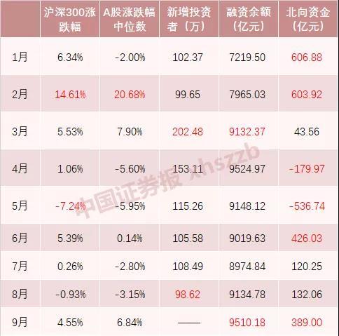 1-2月,北向资金大量涌入; 2月,A股大涨,赚钱效应明显; 3月,新增投资者和融资余额快速攀升,投资者跑步进场; 4-5月,北向资金大举流出,A股进入调整行情,上证指数周线五连阴; 6月,北向资金回流A股,指数反弹; 7-8月,新增投资者数量跌破百万,8月下半月开始指数反弹; 9月,融资余额和北向资金大量回流……