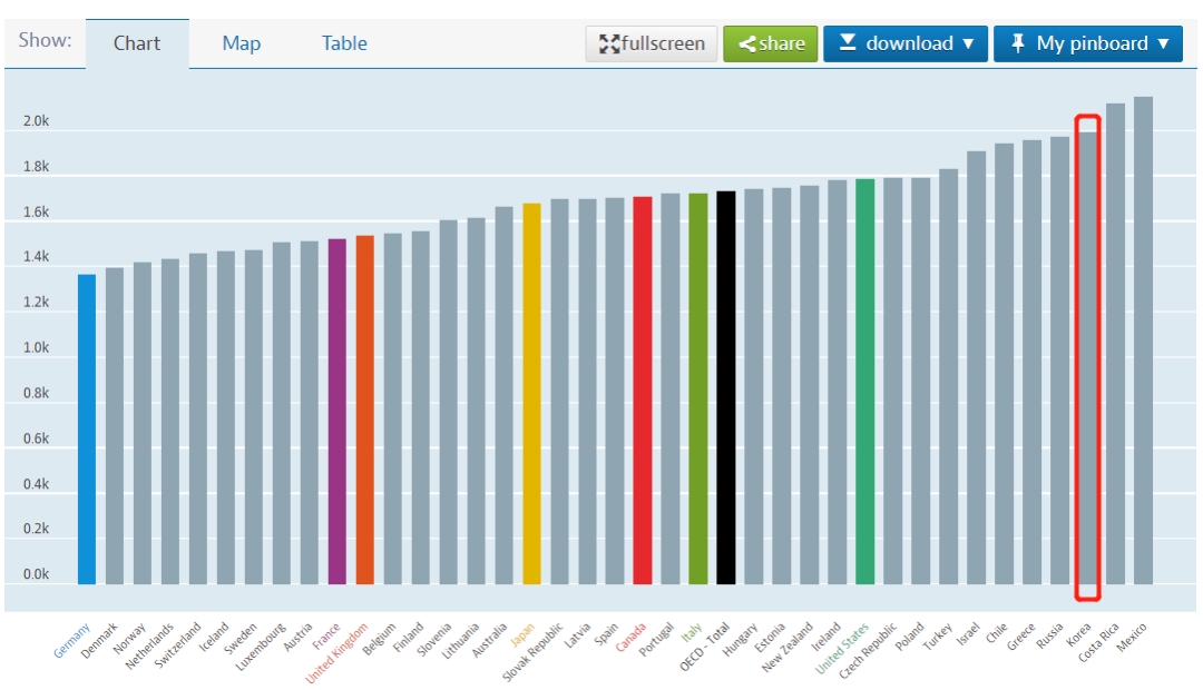 据韩国劳动部发布的数据,2018年全年韩国员工平均工作1986小时,首次低于2000小时。而文在寅政府正力图在2022年将其缩短至1800小时。