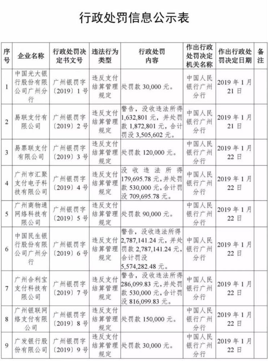 其中涉及光大银行广州分行、民生银行广州分行、广发银行3家银行,及易联支付、易票联支付、广州汇聚支付、广州商物通、广州合利宝支付、广州银联6家第三方支付机构。处罚金额从3万到500多万不等。