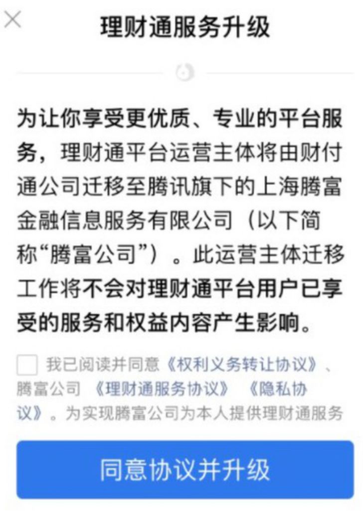 今年9月,腾讯理财通公告,理财通平台运营主体将由财付通迁移至腾讯全资子公司——上海腾富金融信息服务有限公司(简称“腾富金融”)。