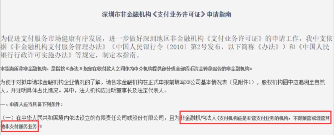 据中国支付网报道,去年,深圳地方央行在其网站更新的《深圳市非金融机构《支付业务许可证》申请指南》里有如下表述:支付机构应是专营支付业务的机构,不得兼营或混营其他非支付服务业务。