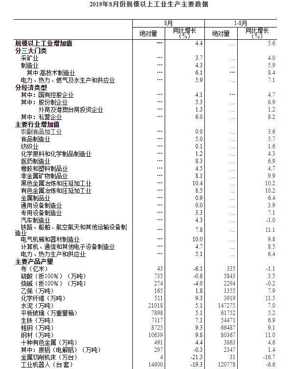 9月16日上午10点,国务院新闻办公室就2019年8月份国民经济运行情况举行新闻发布会,国家统计局新闻发言人付凌晖介绍称,8月份,全国规模以上工业增加值同比增长4.4%,增速比上月回落0.4个百分点;环比增长0.32%,比上月加快0.13个百分点。1-8月份,全国规模以上工业增加值增长5.6%,增速比1-7月份回落0.2个百分点。