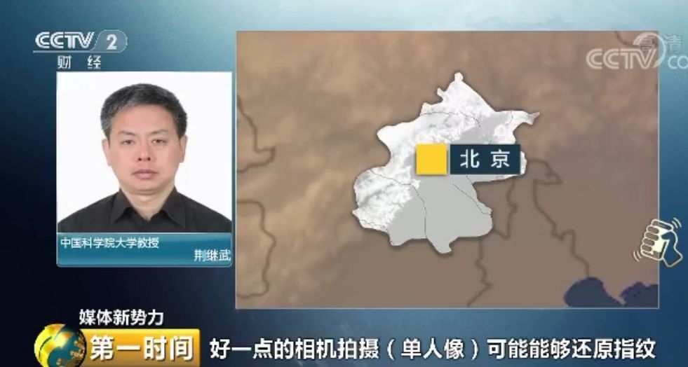 中国科学院大学教授 荆继武:如果用“剪刀手”拍照,好一点的相机拍摄单人像可能能够还原指纹。现在的相机一般能够达到1200万像素,也就是说拍一米长的物体,分辨率可达0.25毫米,利用多张照片有可能恢复指纹。一般情况下由于光线、聚焦等原因,恢复有一定难度,但更高精度的相机恢复起来就简单些。