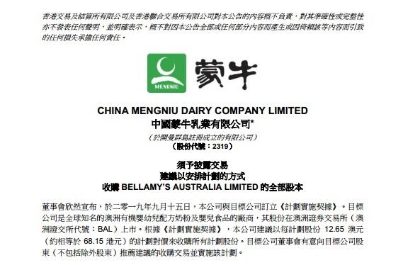 9月16日,蒙牛乳业(2319.HK)发布公告称,公司建议以每计划股份12.65澳元(约相等于68.15港元)的计划对价来收购澳洲奶粉品牌贝拉米(BELLAMY’S AUSTRALIA LIMITED)的全部股本,总对价不超过14.6亿澳元(约相等于78.6亿港元)。贝拉米目前主要从事有机婴幼儿配方奶粉和婴幼儿食品的销售业务,其股份在澳洲证交所上市。