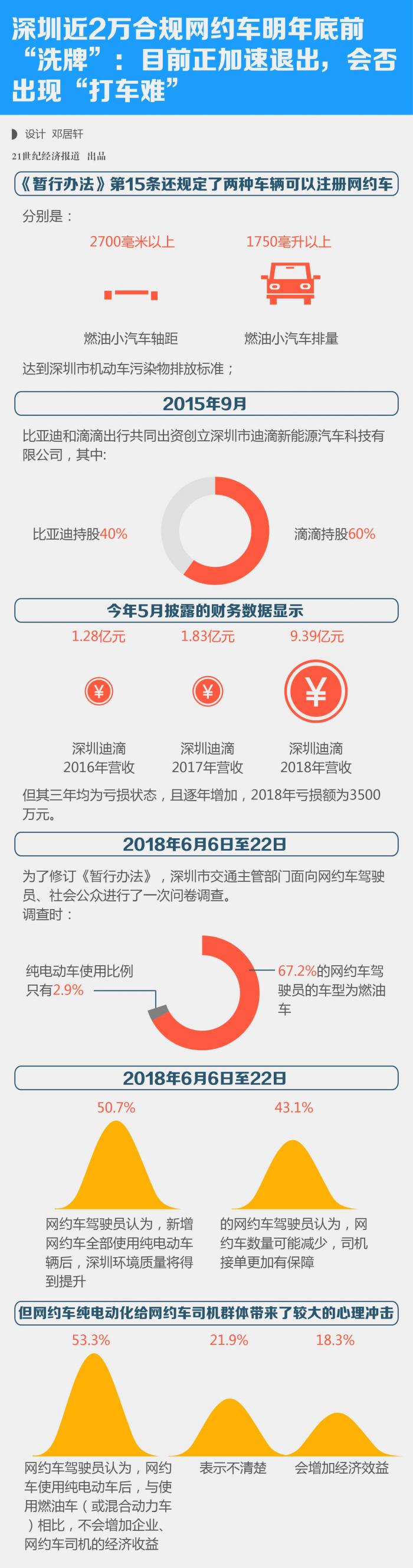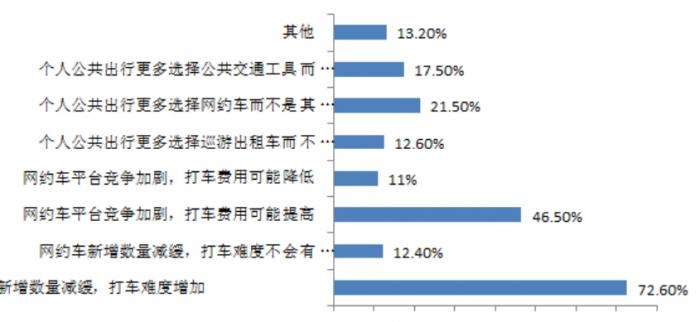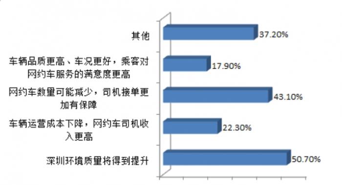 2018年6月6日至22日,深圳市交通主管部门的问卷调查中,72.6%的受调查社会公众认为,新增网约车全部使用纯电动车辆,会出现网约车新增数量减缓,打车难度增加;46.5%的人认为,会出现网约车平台竞争加剧,打车费用可能提高。