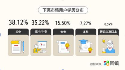 报告还反映,90%以上的用户学历在大专及以下,初中学历者占比最高,达到38.12%,其次是高中和中专学历用户,占比为35.22%。下沉市场用户从事的职业种类繁多,其中,15.89%的用户在家务农,15.21%的用户是个体工商户,27.17%的用户在私企或其他类型企业工作,也有7.61%的用户在机关及事业单位就职。据58同镇调研数据显示,学历水平制约着县域居民就业范围,初中及以下学历居民大多务农或从事建筑工人、安保等体力劳动,而大专以上学历者以从事机关、教师、医生等工作为主。