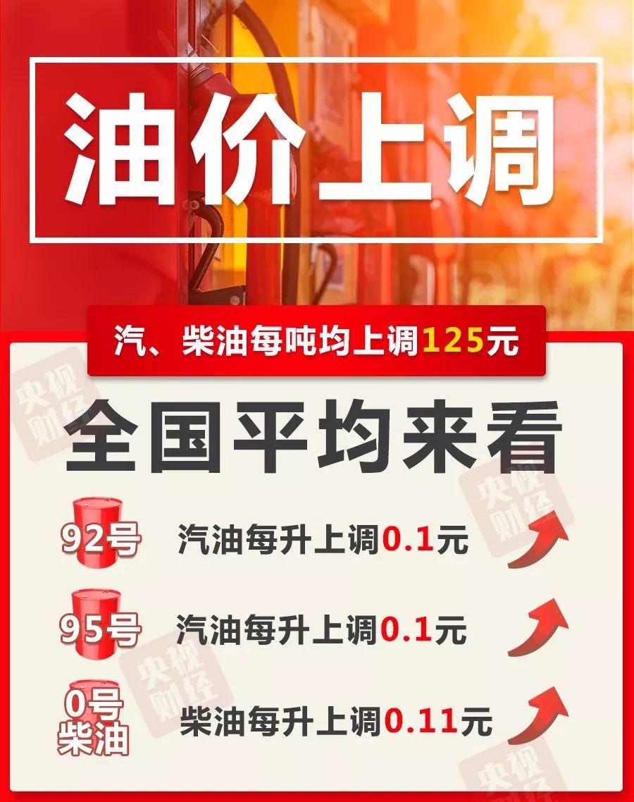 92号汽油每升上涨0.1元; 95号汽油每升上涨0.1元; 0 号柴油每升上涨0.11元。