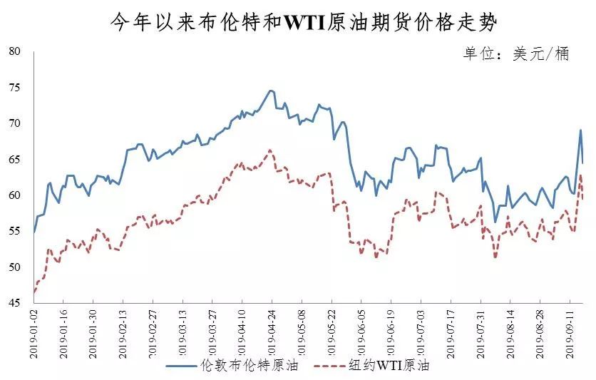 沙特一处石油加工设施及一处油田遭受袭击,是本轮调价周期内油价上涨的主要原因。袭击事件发生后,沙特出于安全考虑,主动关停了约500万桶/日的原油产能,约占沙特当前产油量的一半。供应预期减少带来的恐慌情绪助推油价大涨,9月16日布伦特、WTI原油期货开盘一度分别暴涨19%、15%。此后价格冲高回落,9月17日两市油价分别为每桶64.55美元、59.34美元,比袭击前分别上涨7.19%、8.19%。