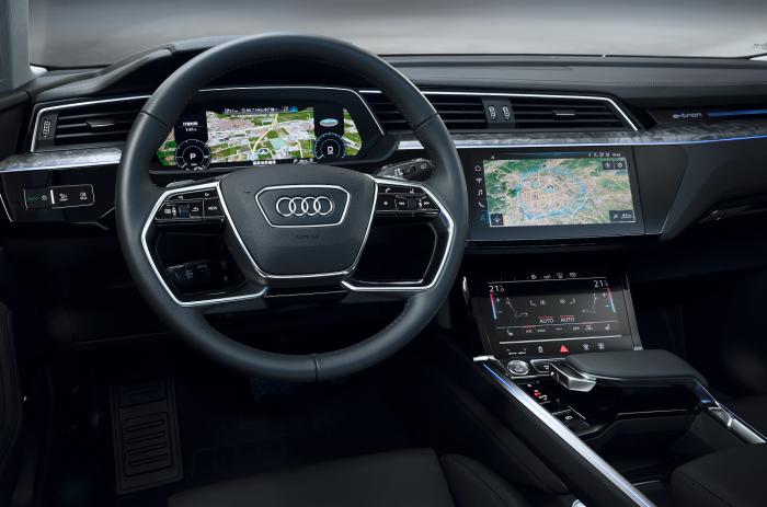 在智能交互方面,奥迪e-tron 的无框式12.3英寸奥迪虚拟座舱,在同级中唯一可在仪表盘看到最完整导航地图,所有车辆功能信息一览无余,驾车更安全。此外,10.1英寸+8.6英寸中控双显示屏,触控时会通过声音和触觉反馈得到确认,实现盲操作,有效保障行车安全。