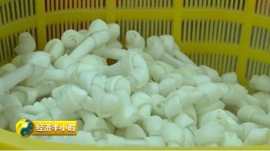狗咬胶是一种宠物狗可以食用的玩具,狗咬胶的形状多种多样,而这种骨头形状的是销量最大、出口订单中最受欢迎的样式了,原材料主要是牛皮的第二层,洗白后晒干制作而成的。记者采访的这家宠物玩具企业一年的产量就在6000吨左右。