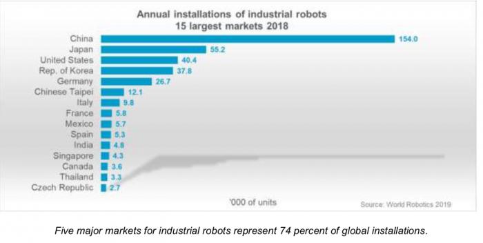 9与18日,中国机器人产业联盟(简称CRIA)在《全球机器人2019(World Robotics2019)》上,发布了2018年中国工业机器人市场统计数据。数据显示,中国工业机器人市场销量首次出现下滑,但年销量连续第六年位居世界首位,自主品牌机器人销售保持稳定增长。