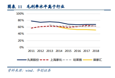 丸美品牌以眼霜品类切入,定位中高端,据华创证券研报,丸美的线下客单价约400元。华创证券表示,丸美股份的综合毛利率达到68.34%,而可比公司上海家化、珀莱雅、御家汇的毛利率位于50%~64%之间。
