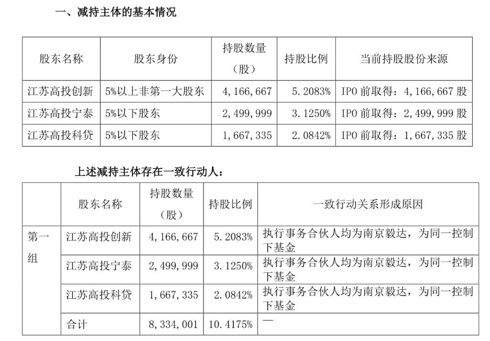 公告显示,此次披露减持计划的三位股东,高投创新、高投宁泰和高投科贷的持股比例分比为5.21%、3.13%和2.08%。同时,由于三位股东的执行事务合伙人均为南京毅达,因此构成一致行动人关系。