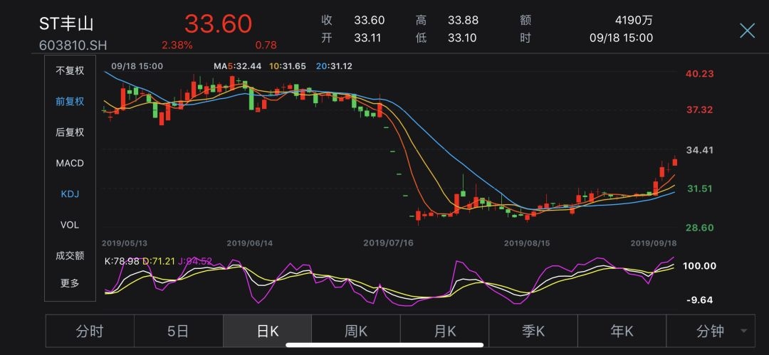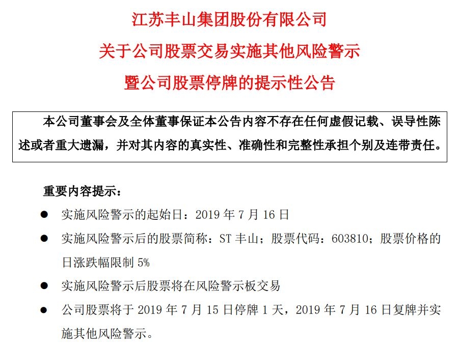 于是,公司股票于7月15日停牌1天,7月16日复牌后股票简称由“丰山集团”变成了“ST丰山”。而2018年9月17日才上市的ST丰山,在上市不到10个月就被ST,这也创下了A股ST的最快纪录。复牌后,公司股价迎来连续5个“一”字跌停。