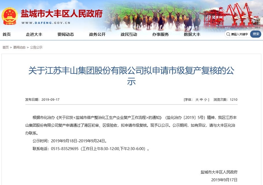 实际上,很多关系ST丰山复产的中小股东在9月17日就发现,盐城市大丰区人民政府在官方网站上披露了《关于江苏丰山集团股份有限公司拟申请市级复产复核》的公告,公示时间为9月18日-9月24日。
