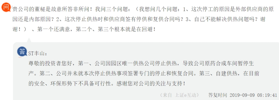 另一方面,在很多中小股东看来,公司还没复产三个股东就要跑,太不够意思了。9月18日晚间,ST丰山披露称,截至目前,公司复产验收流程尚未结束,供热公司暂未恢复供热,公司原药合成车间尚处于临时停产状态,复产时间仍具有不确定性。