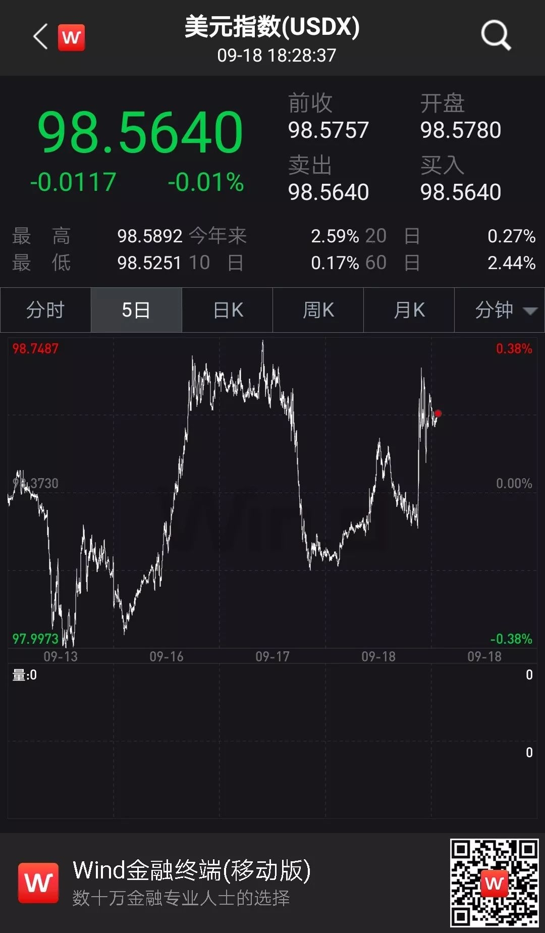 纽约尾盘,美元指数涨0.37%报98.5757;欧元兑美元跌0.39%报1.1029;英镑兑美元跌0.24%报1.2470;澳元兑美元跌0.55%报0.6828;美元兑日元涨0.29%报108.445;离岸人民币兑美元涨31个基点报7.0832。