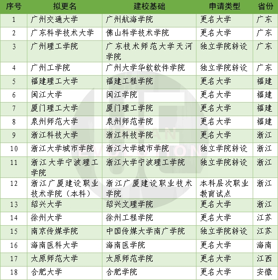 此后,在教育部2018年、2019年公布的当年“拟批准设置的高等学校名单”中,又有51所高校更名申请先后获批。