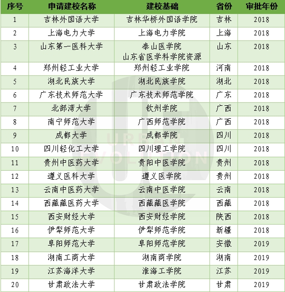 教育部2018年和2019年公布的“拟批准设置的高等学校名单”中,由“学院”更名为“大学”的高校名单统计 数据来源:教育部官网