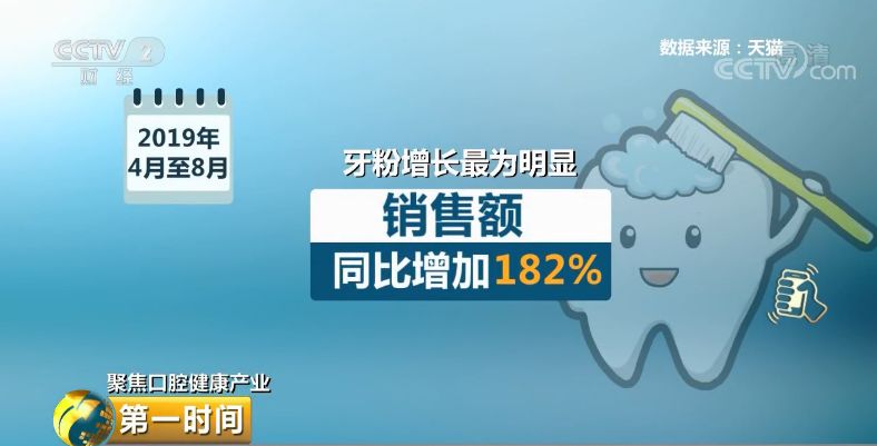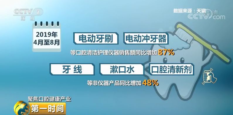 天猫平台数据显示,2019年4月至8月,电动牙刷、电动冲牙器等口腔清洁护理仪器销售额同比增加87%,牙线、漱口水、口腔清新剂等非仪器产品同比增加48%。其中,牙粉增长最为明显,销售额同比增加182%。