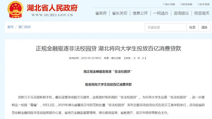 2017年6月,湖北省政府发布《关于加强校园网贷管理有关问题的通知》,对已从事校园网贷业务的网贷机构,一律暂停新发校园网贷业务标的,并制定明确的退出整改计划。鼓励商业银行等金融机构进驻校园发挥主力军作用,针对大学生消费实际,创新金融服务和产品,形成对非法校园网贷的“挤出效应”。