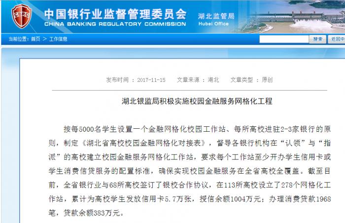 2017年11月,原湖北银监局联合省金融办、教育厅下发了《关于推进校园金融服务网格化工作的通知》。各银行业金融机构针对高校金融服务空白,在现有网点基础上将校园网格工作站纳入未来机构设置规划,主动“认领”高校。每所高校平均5000名学生至少一个校园网格工作站,每所高校进驻2至3家银行,力争9月份实现校园金融服务网格化工作站在全省129所高校全覆盖。