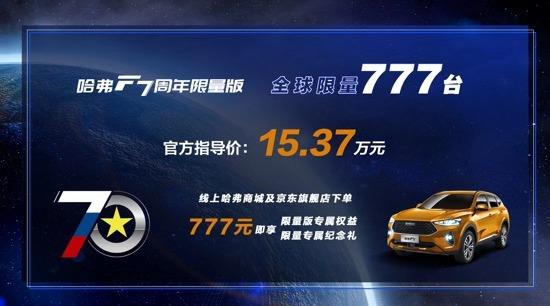 9月19日,长城汽车旗下哈弗F7周年限量版正式上市。新车售价15.37万元,以线上哈弗商城及京东旗舰店为主销渠道,全球限量发售777台。