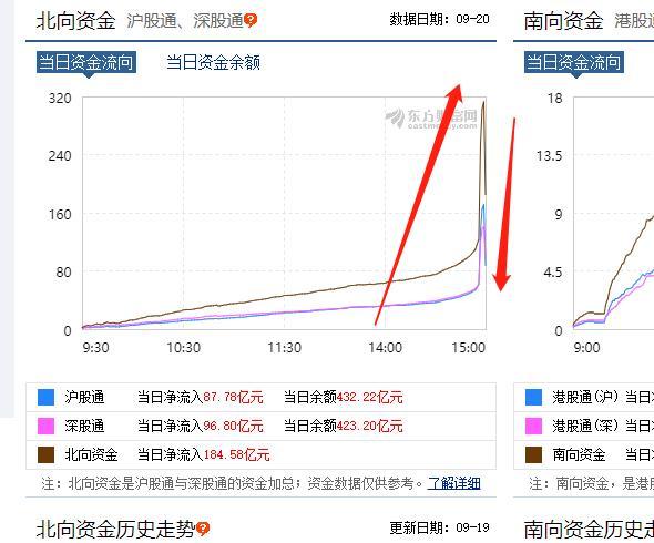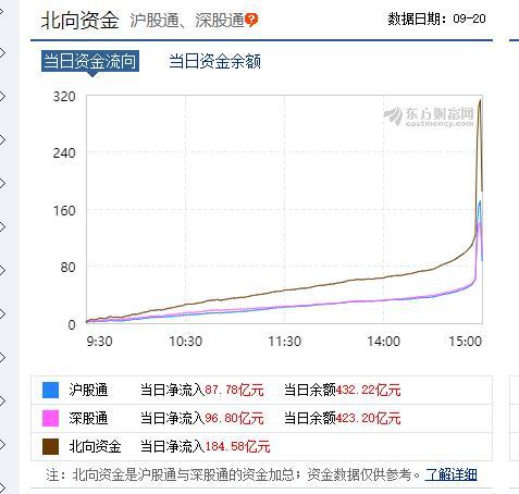 如市场预期的那样,9月20日尾盘集合竞价阶段,北向资金再次出现了脉冲式的暴力流入,收盘后当日北上资金净流入的规模高达184亿创下了近一段时间的最高值。
