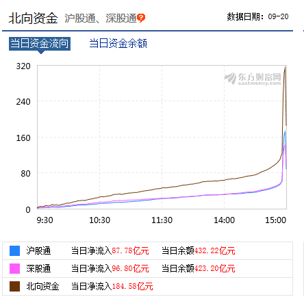 周五,北向资金全天单边上扬,合计净流入148.62亿元,创下今年来新高、历史第二高纪录。其中,沪股通渠道净买入71.37亿元,深股通渠道净买入77.25亿元。 9月20日收盘后,富时罗素以及标普道琼斯两大指数公司指数调整生效,将合计为A股带来51亿美元的被动增量资金。较前几次指数调整生效,这一数字也创下了年内新高。