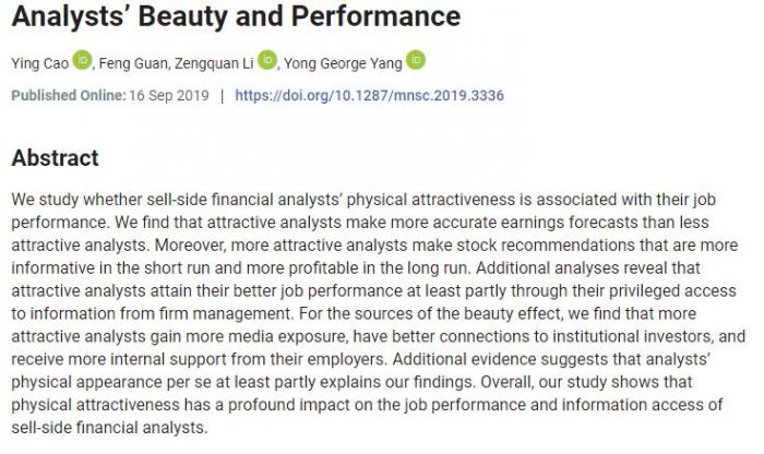 近日,学术期刊《管理科学》上发布了一篇名为“分析师外貌和业绩”(Analysts’ Beauty and Performance)的论文。这一论文指出,通过研究卖方金融分析师的外表吸引力和工作表现,可以发现外表更具吸引力的分析师更能做出准确的盈利预测。此外,外表更有吸引力的分析师给出的股票建议从短期来看信息量更大,而长期则能给投资者带来更高回报。