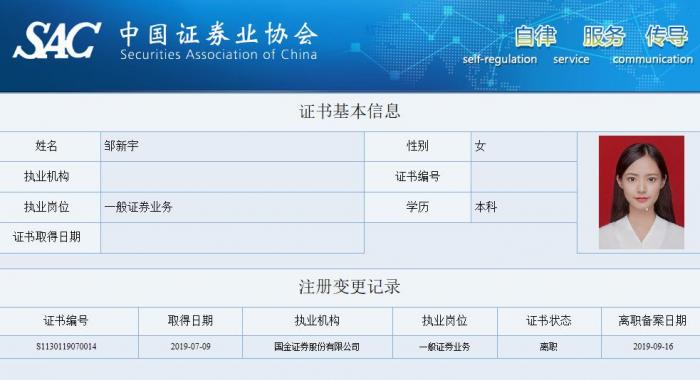 这则消息流传开后,国金证券火速回应称,邹新宇应聘的是国金证券研究所销售支持岗,这个岗位的招聘要求主要有三点:一是基本的学历要求;二是综合协调能力;三是相关金融知识。