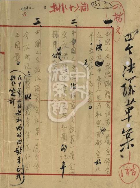 中国人民政治协商会议第一届全体会议通过的关于国旗、国徽、国歌、国都、纪年的四个决议草案: